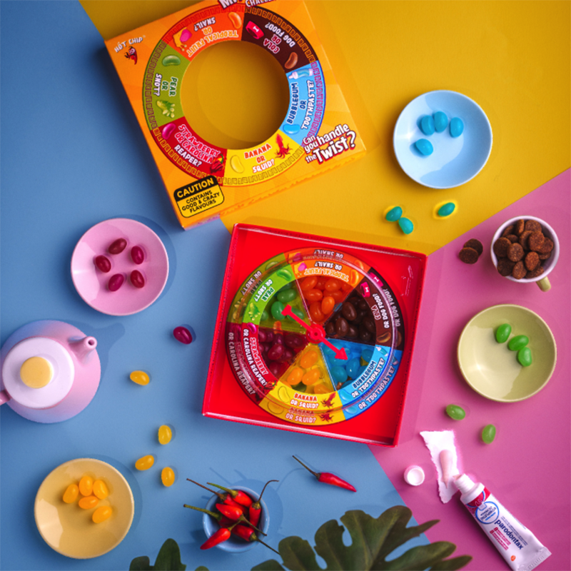Get ready for a wild twist of flavor! Our Twister Jelly Beans bring an explosive mix of fruity, tangy, sweet or gross flavours that keep you coming back for more. Each jelly bean can be a sweet delight or a wild surprise. With each spin, you can savor the taste of cola or prepare for the unexpected taste of dog food. Get a delicious Banana or Octopus? Maybe you'll taste a sweet strawberry or face a Carolina Reaper chili pepper?